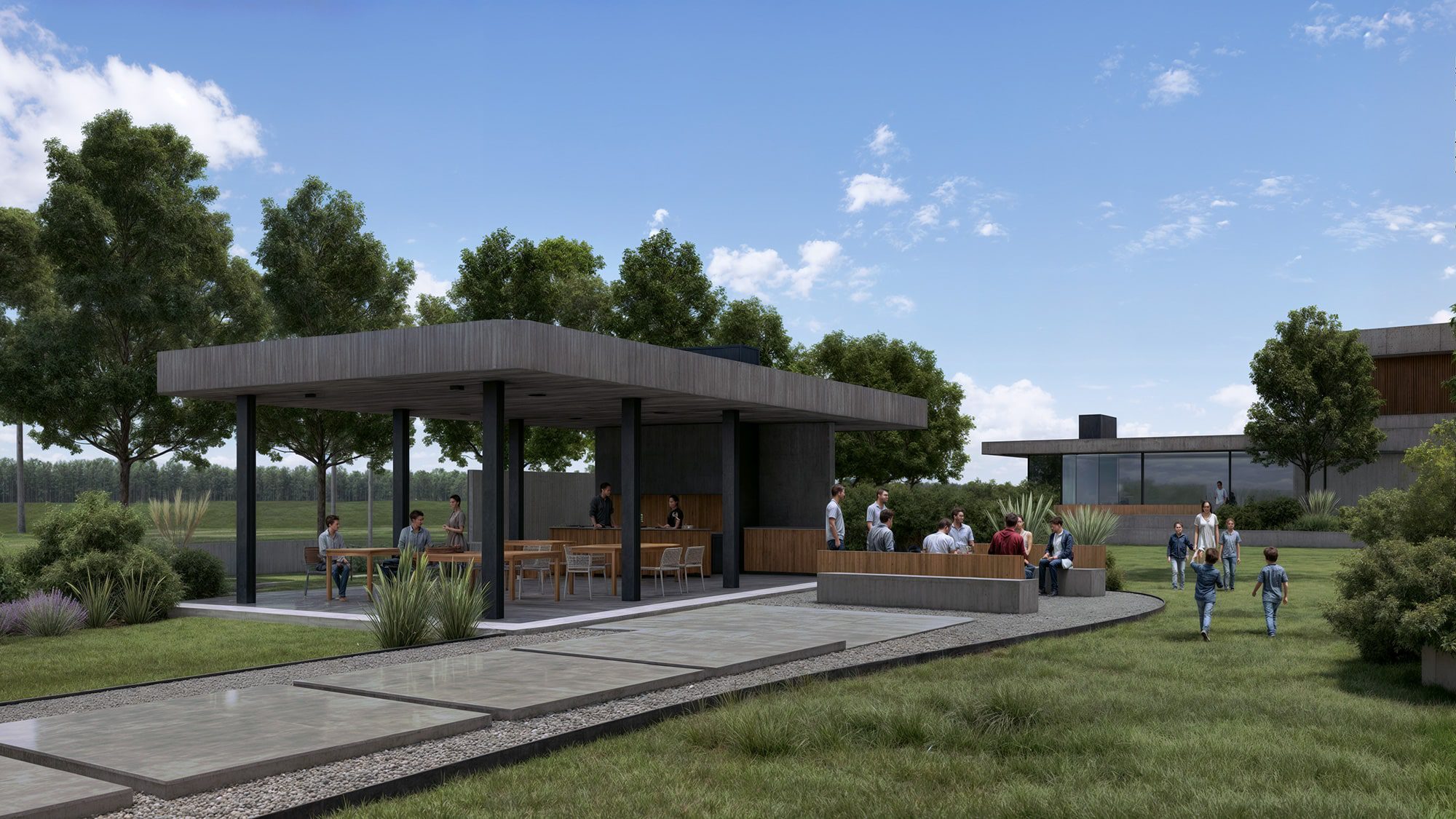 Es un espacio cerrado y equipado para acompañar celebraciones, talleres, reuniones o encuentros sociales. Rodeado de áreas verdes, sector de parque y rincón de fuego, se complementa con espejos de agua que suman serenidad y una estética única.